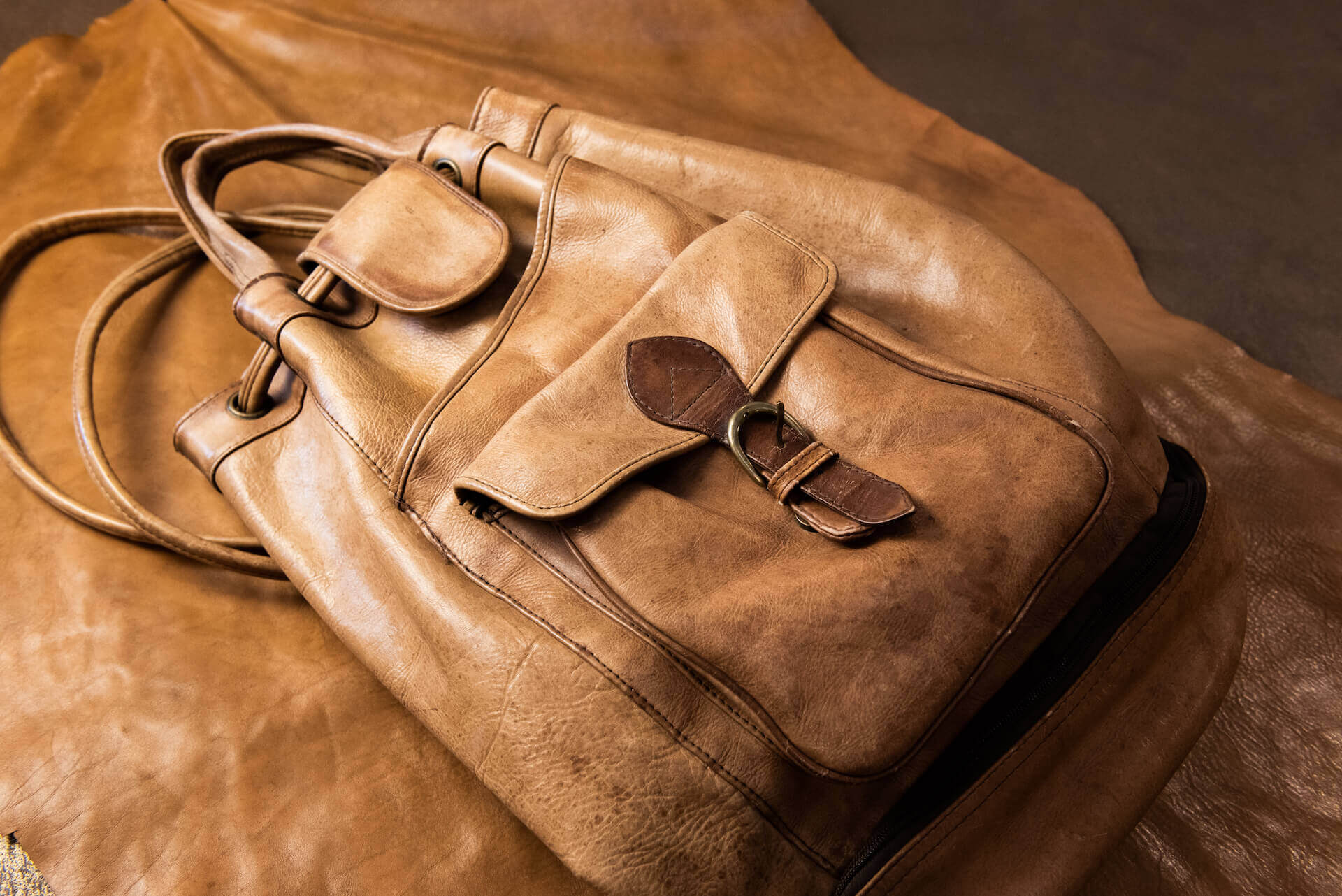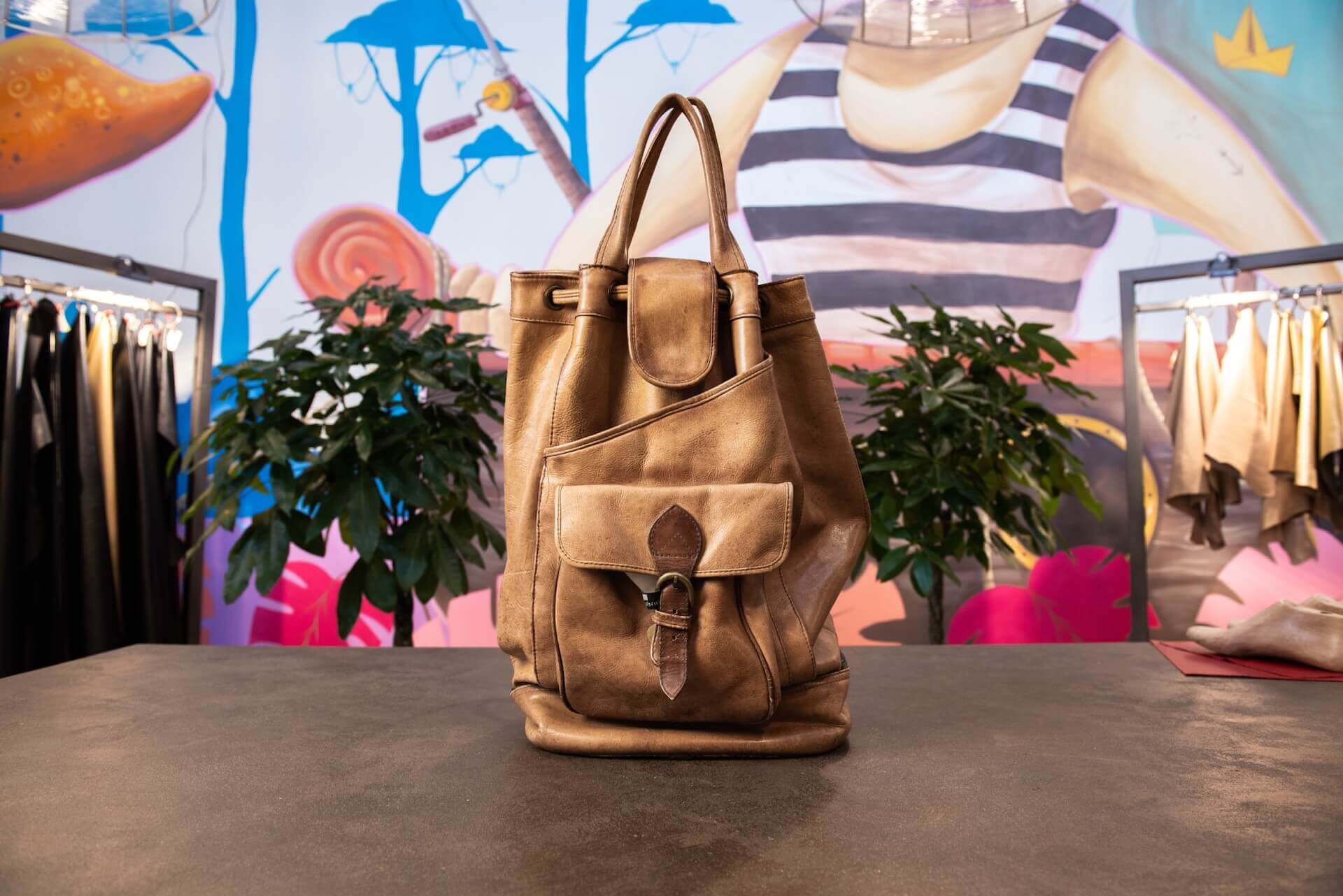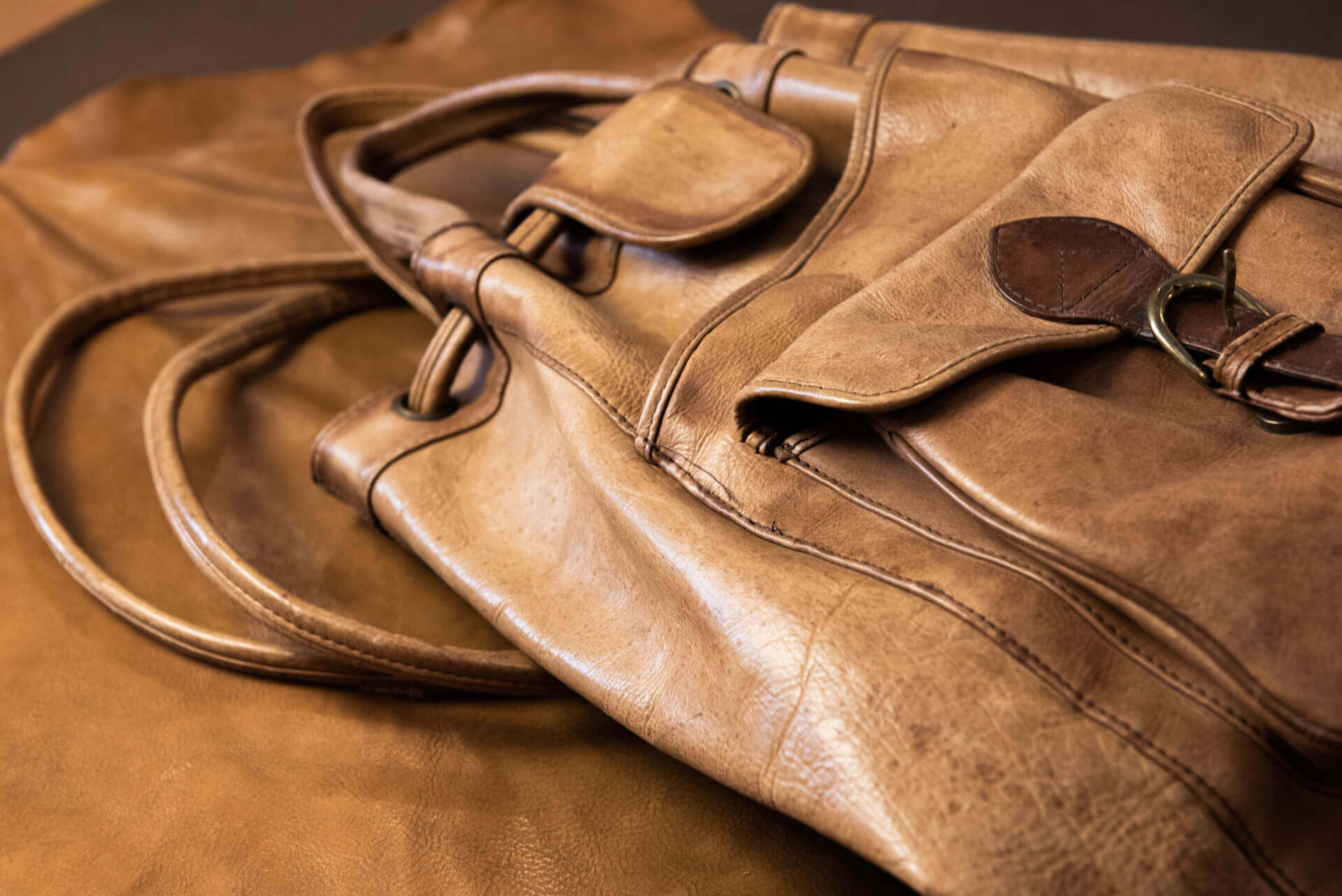 Sacca sportiva e artigianale, con chiusura a coulisse e completa di diverse tasche e scompartimenti utility. La pelle con cui è stata realizzata ha un aspetto naturale, sia nel colore che nella finitura, presenta segni di invecchiamento da utilizzo come raggrinzimenti, piccole macchiature e inscurimento delle finiture alle estremità.