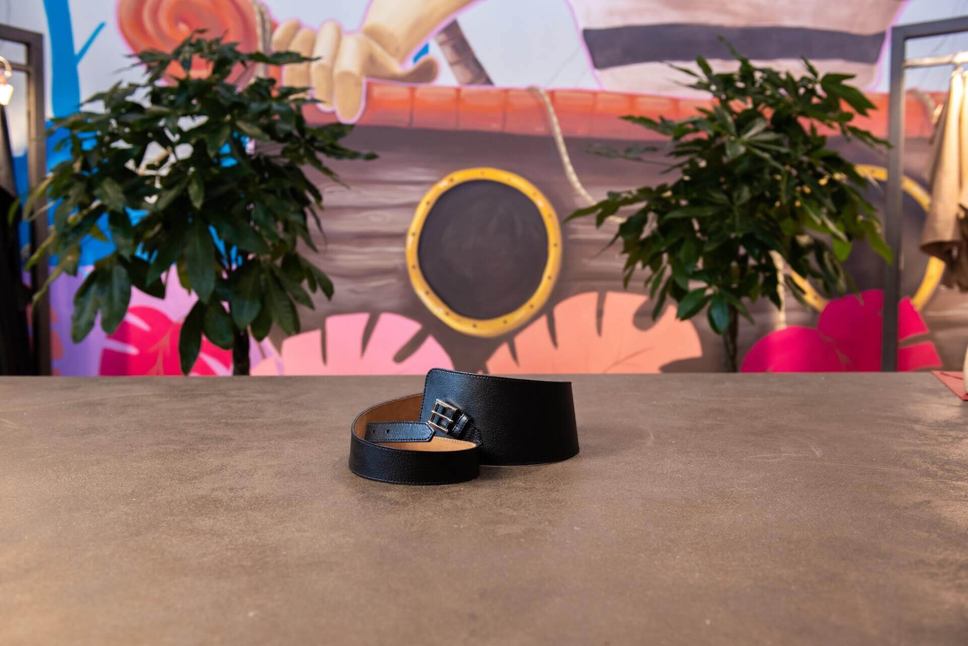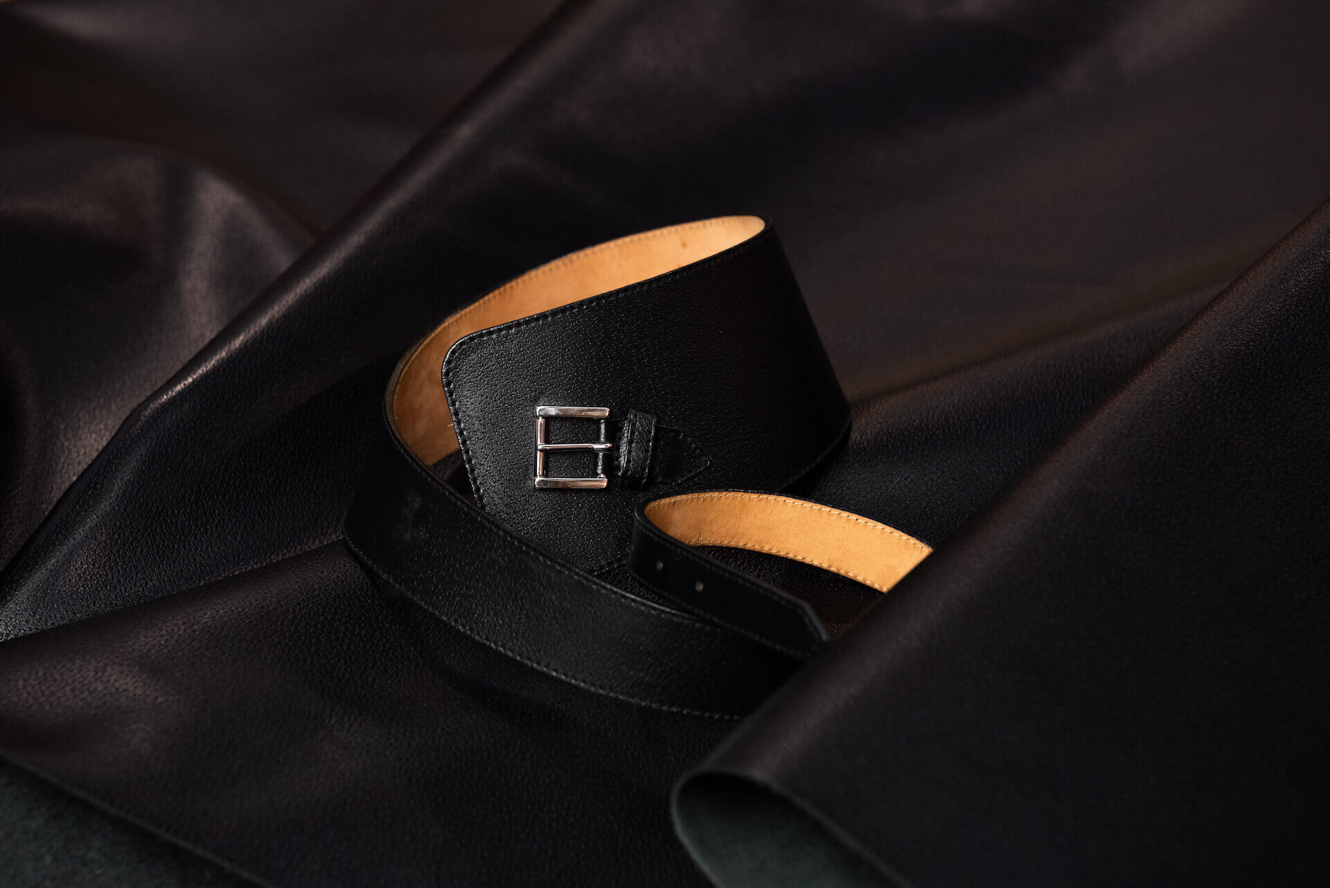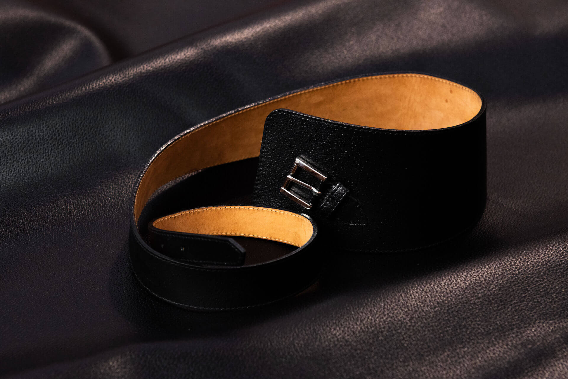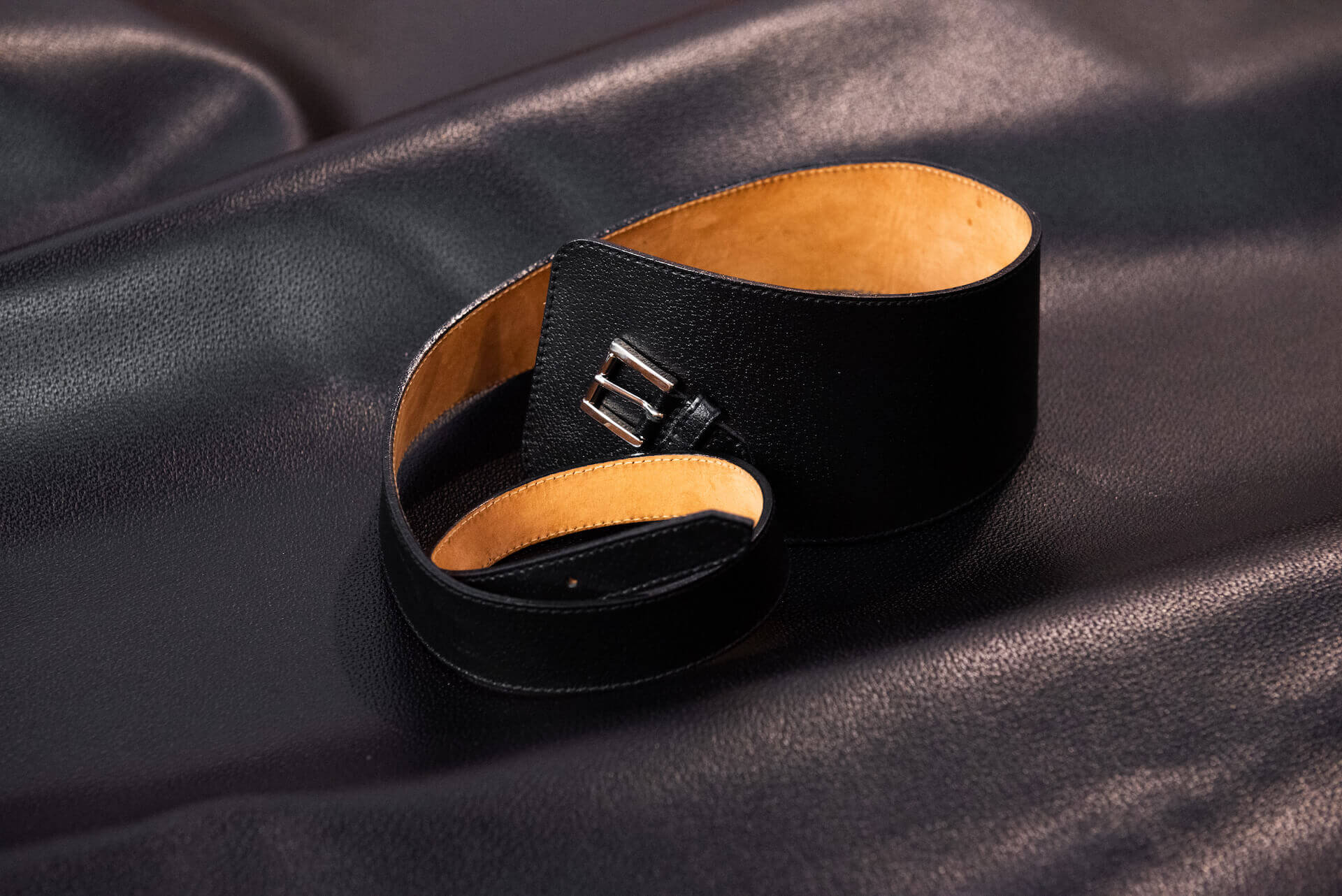 Cintura asimmetrica da indossare in vita. La pelle con cui è stata confezionata ha un aspetto lucido che enfatizza una leggera stampa cinghiale che anima la superficie.