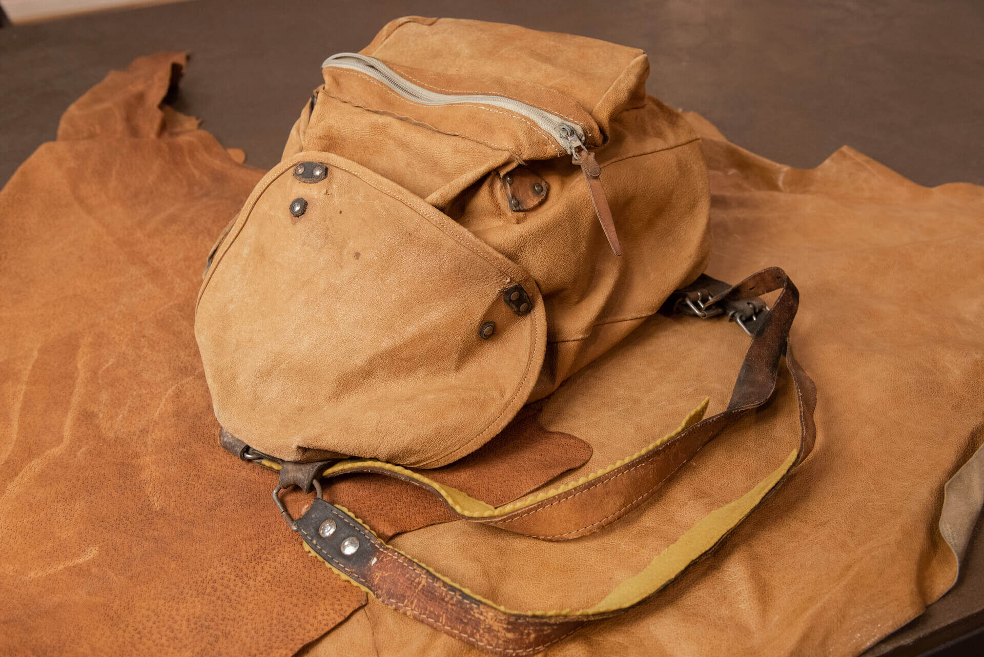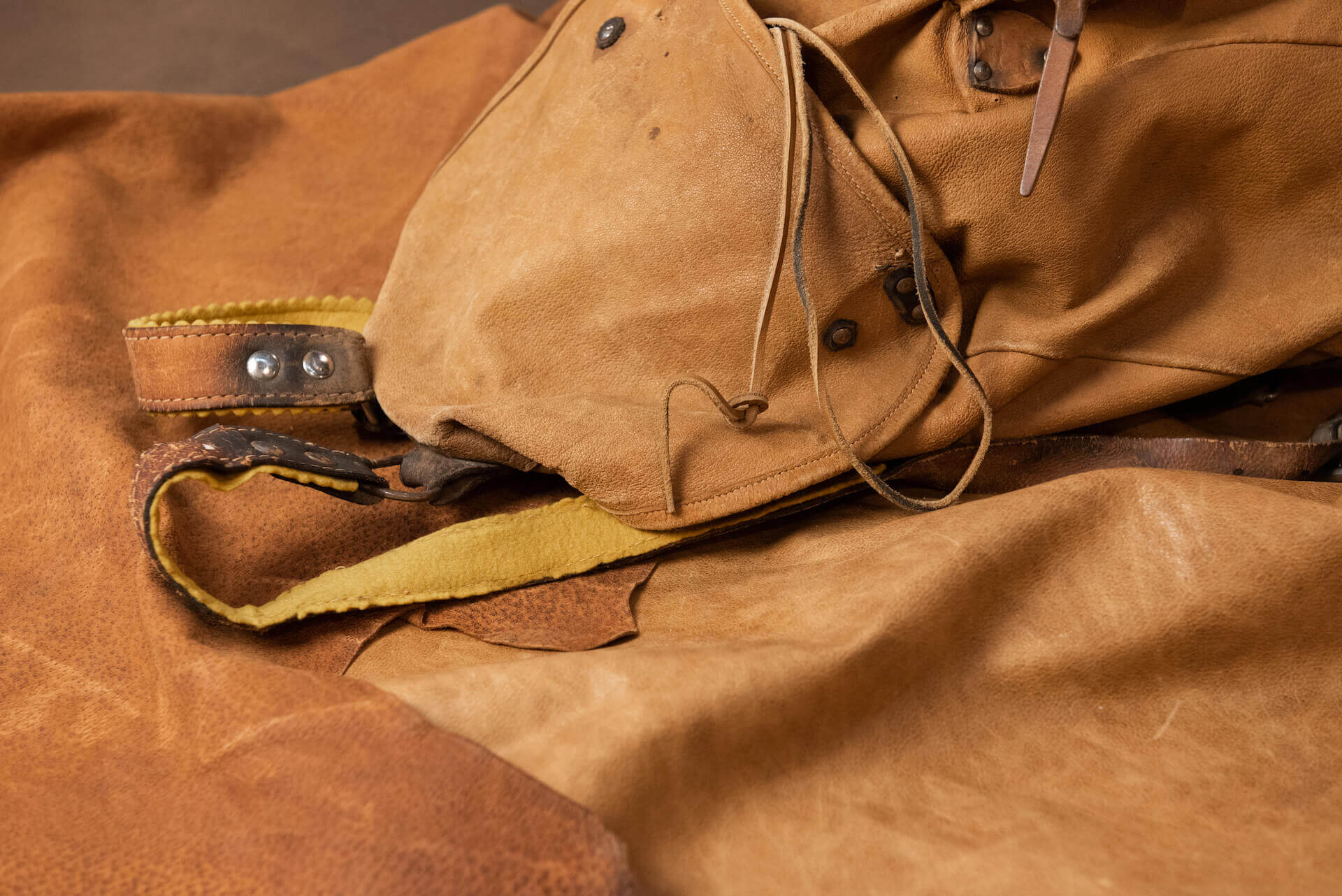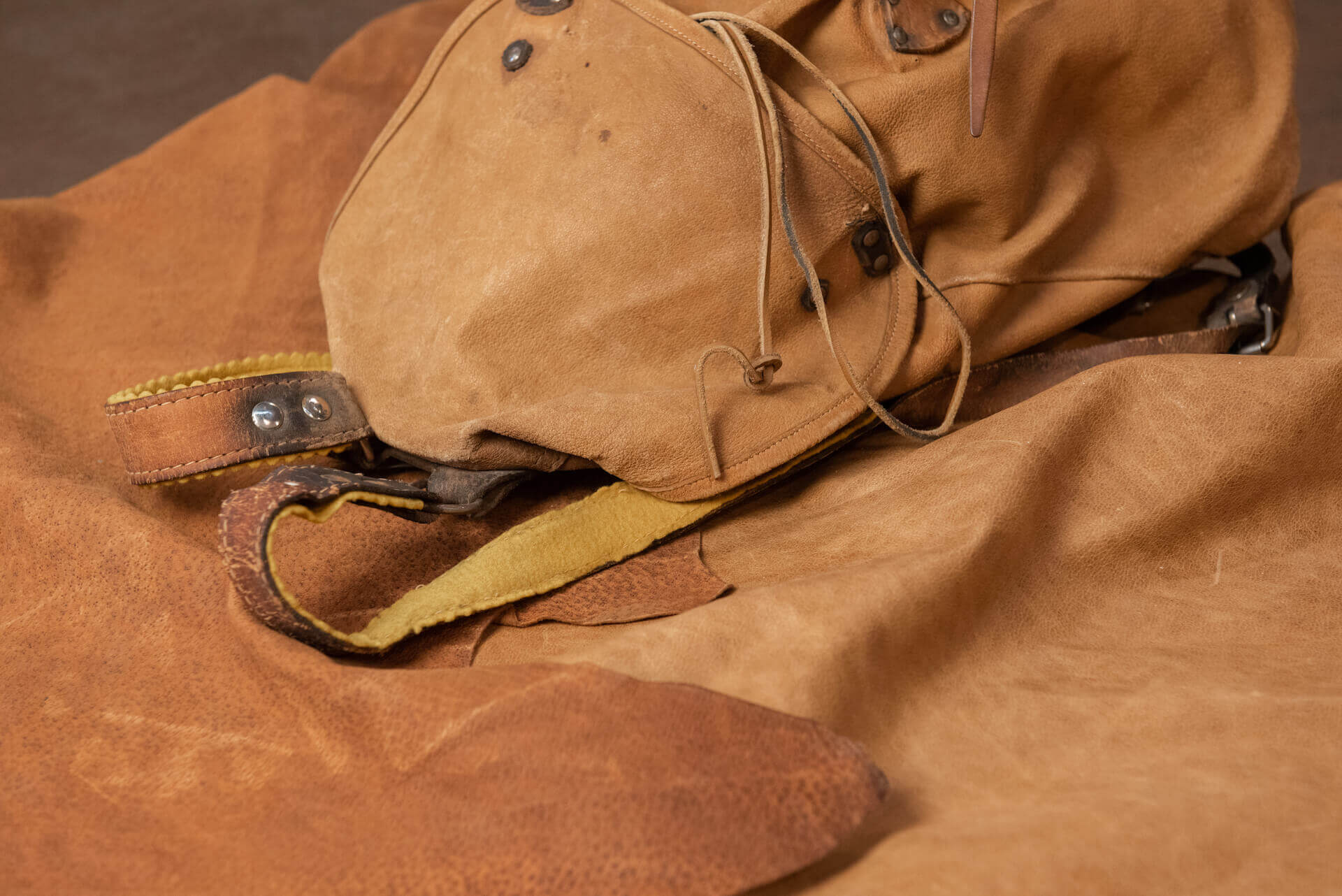 Zaino da escursionismo in pelle vegetale. L’oggetto presenta segni di usura che in diversi punti hanno mangiato la superificie della pelle creando interessanti sfumature bicolore.