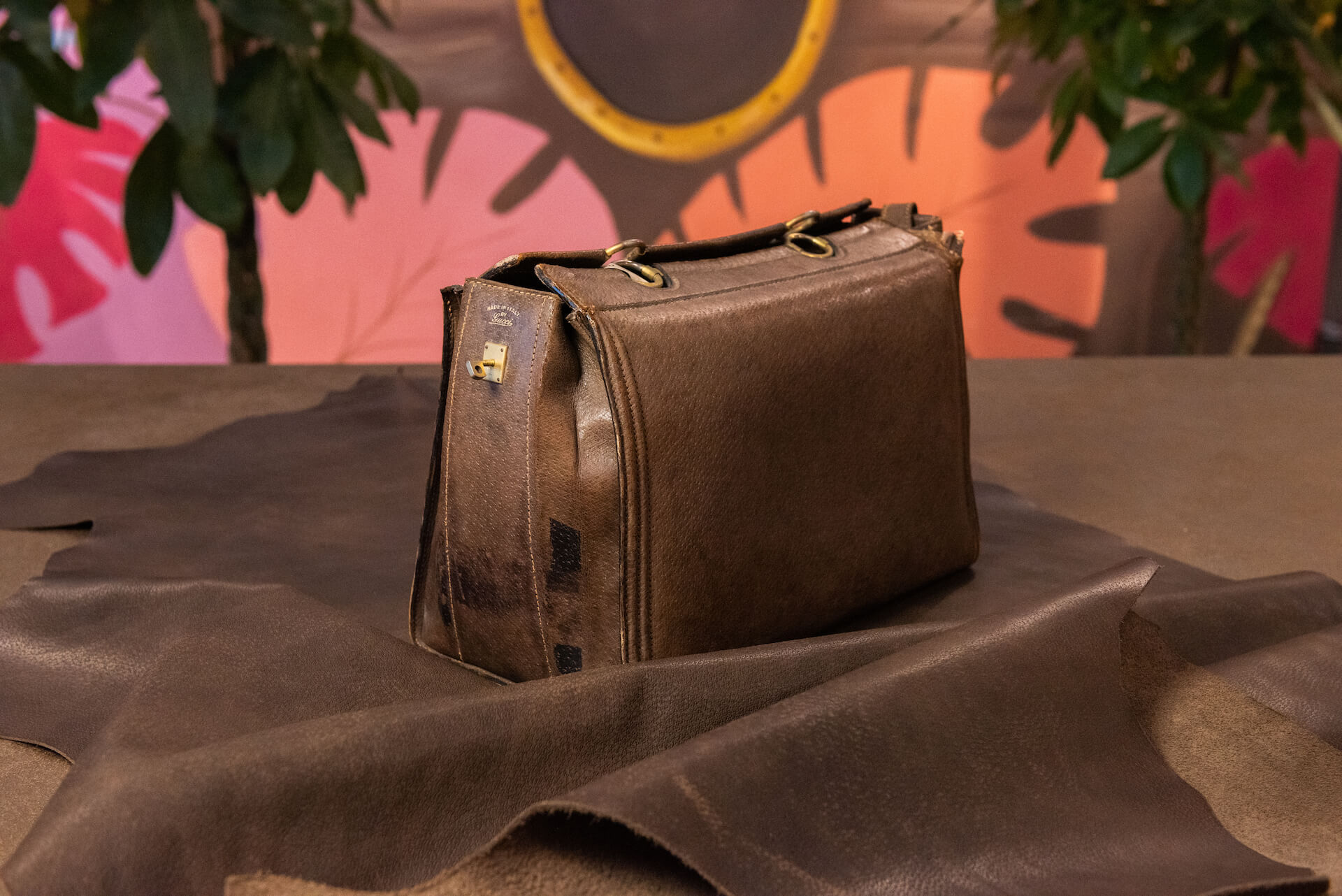 Doctor bag con chiusura sovrapposta a girello metallico. Il pellame, stampato cinghiale, presenta macchiature a contrasto dovute al naturale invecchiamento. L’interno è rivestito in crosta.